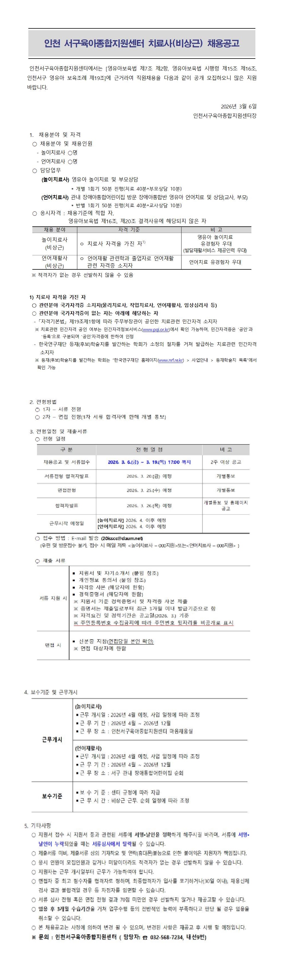 「인천서구육아종합지원센터 치료사(비상근) 공고」