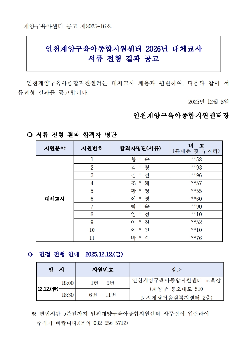 [인천계양구육아종합지원센터] 「2026년도 대체교사지원사업」 대체교사 서류전형 결과 공고