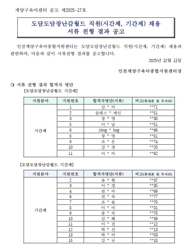 도담도담장난감월드 직원(시간제, 기간제) 채용 서류전형 결과 공고