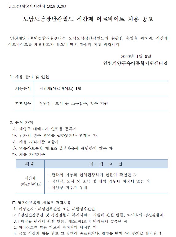 도담도담장난감월드 직원(시간제 아르바이트) 채용 공고