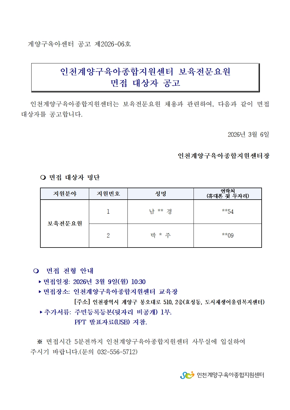인천계양구육아종합지원센터 보육전문요원 채용 면접대상 공고