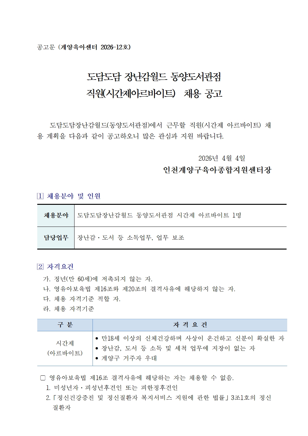 도담도담장난감월드 동양도서관점 직원(시간제 아르바이트) 채용 공고