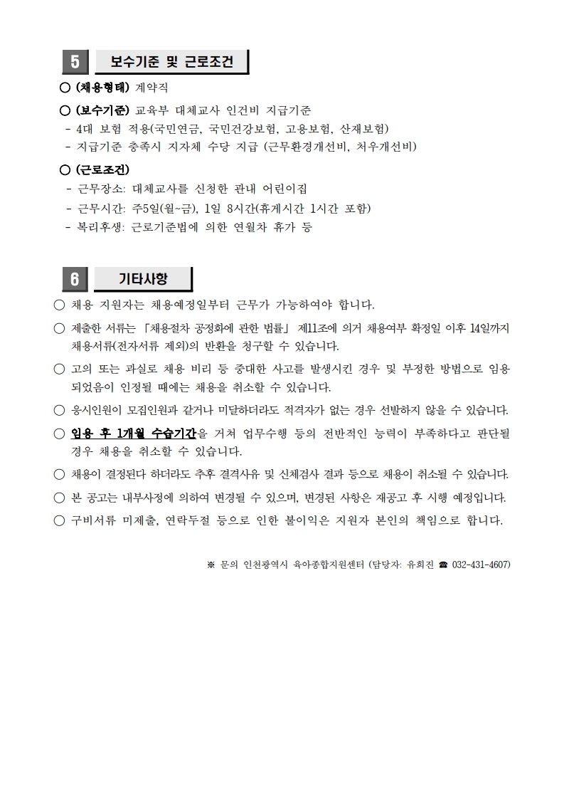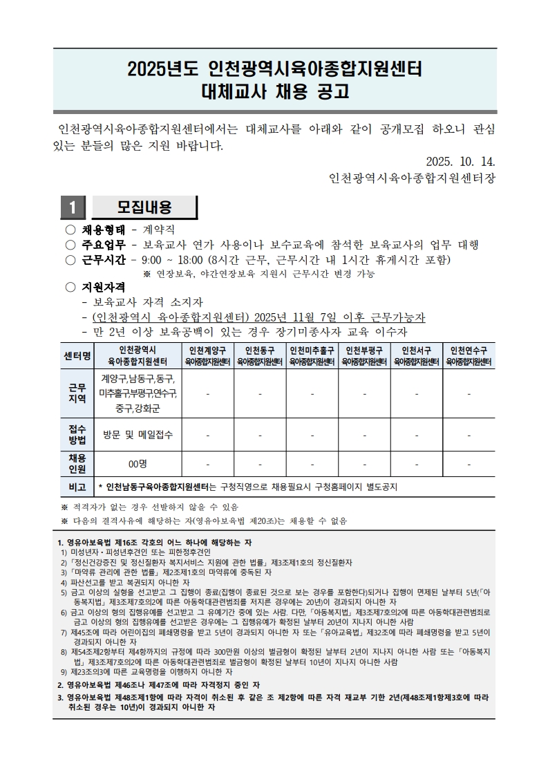 [인천광역시육아종합지원센터] 「2025년도 대체교사지원사업」 대체교사 인력채용