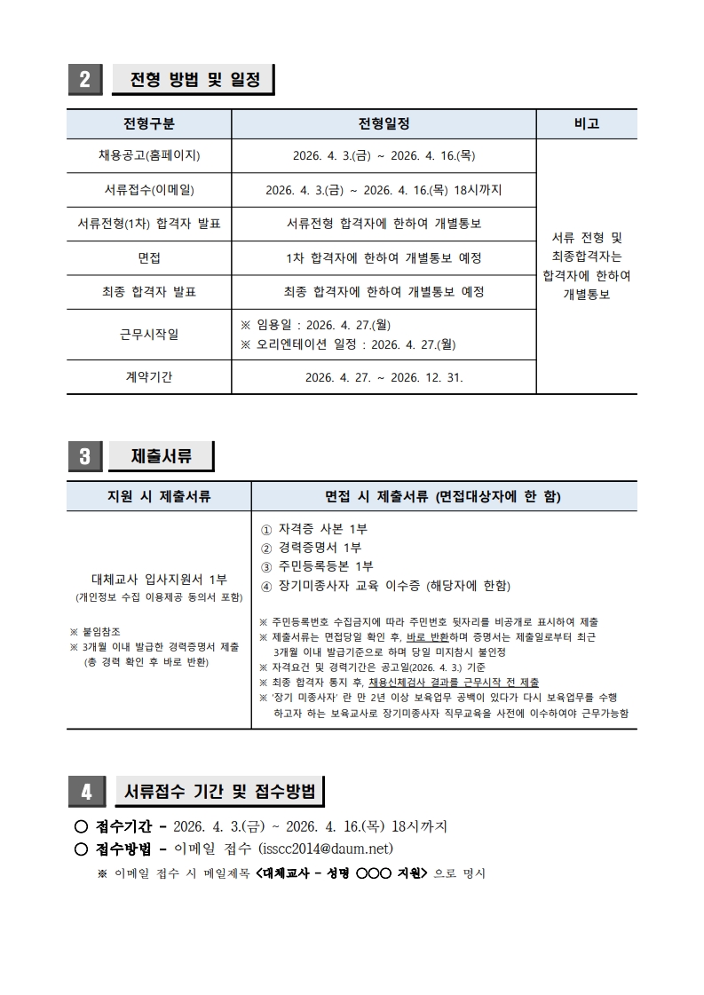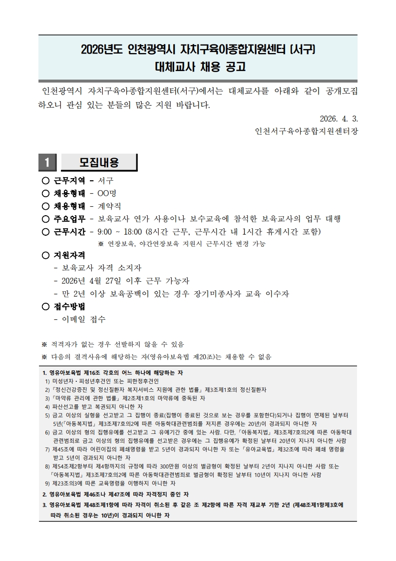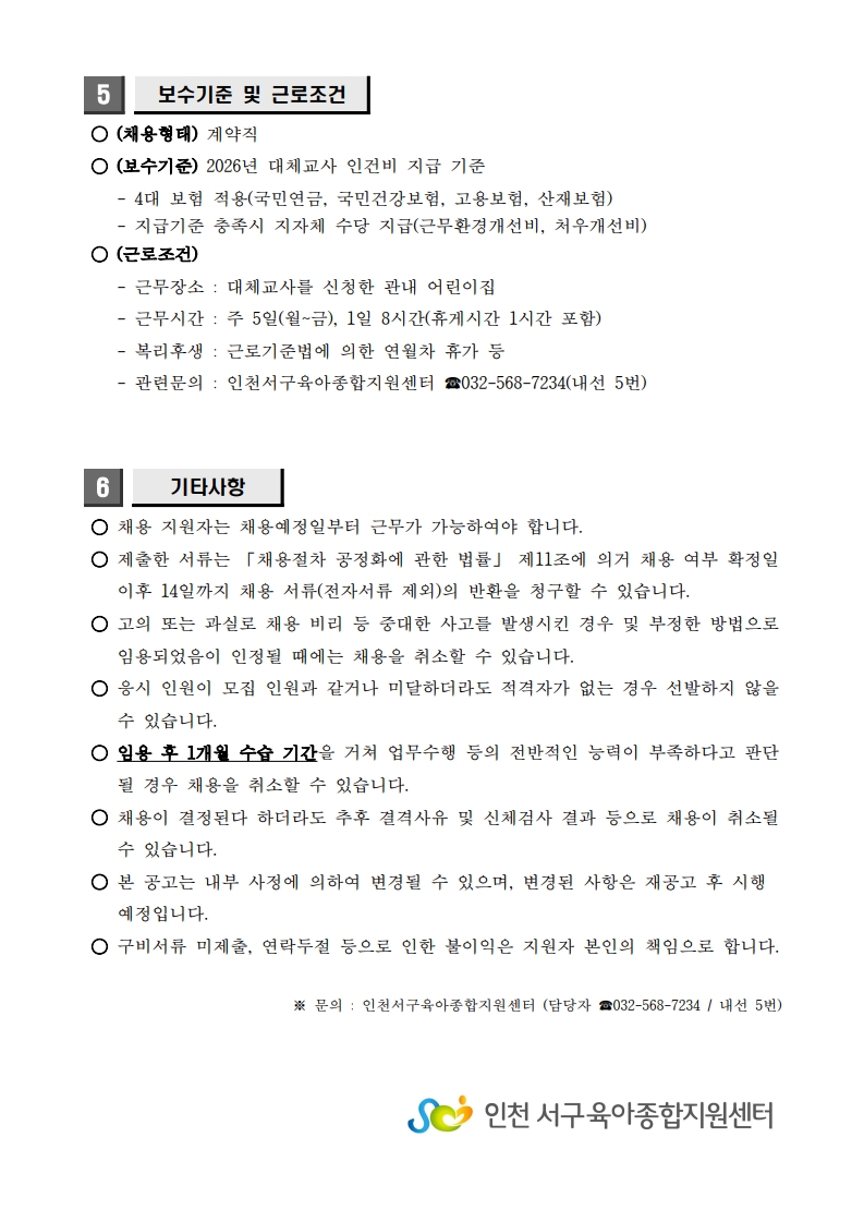 (서구육아2026-268)인천서구육아종합지원센터 대체교사 6차 채용 공고