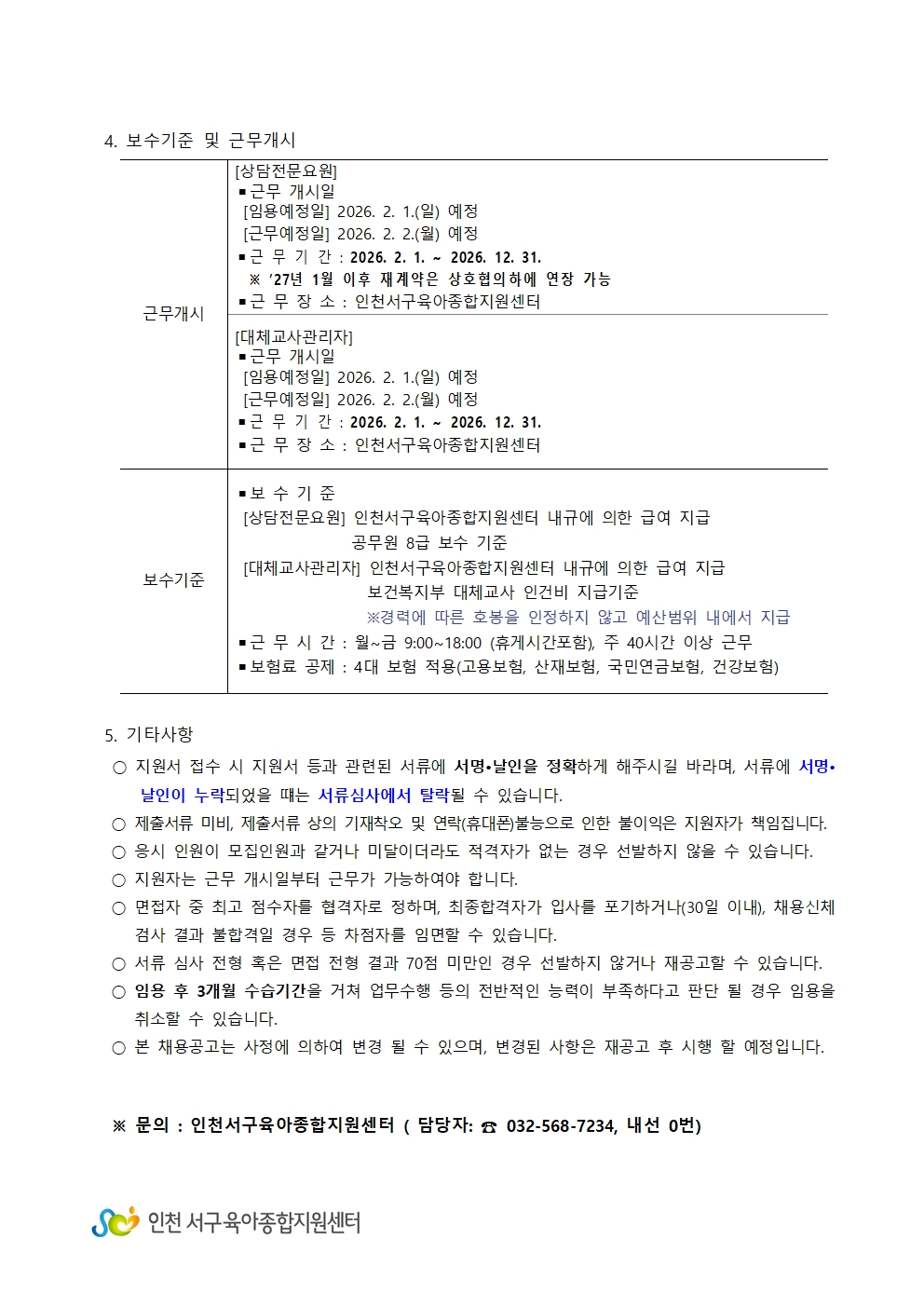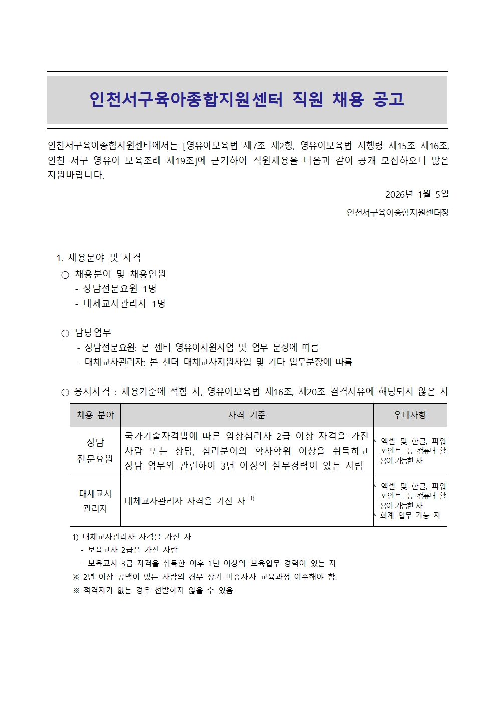 [인천서구육아종합지원센터] 직원(대체교사관리자, 상담전문요원) 채용 공고