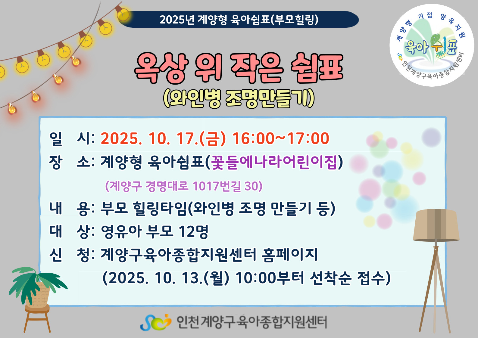 기타사항 | 계양형 육아쉼표 교육으로 지역의 거점어린이집에서 진행됩니다. 교육 장소는 꽃들에나라 어린이집 입니다. (계양구 경명대로 1017번길 30) |