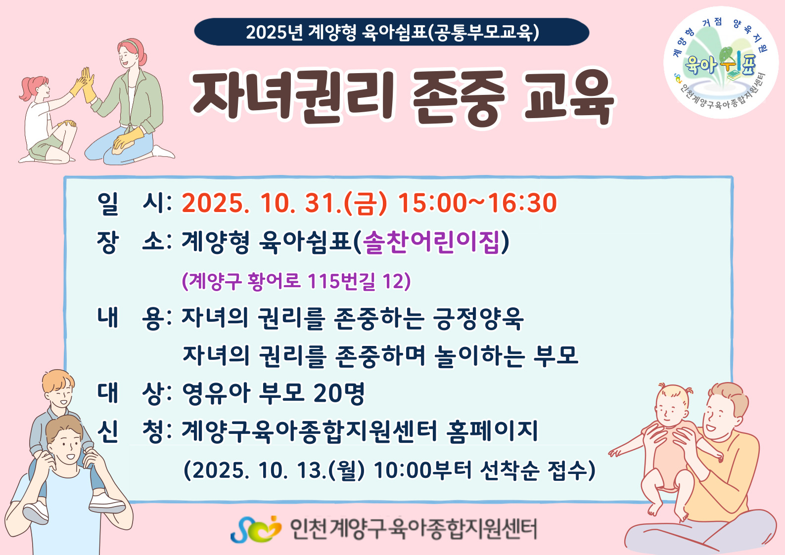 기타사항 | 계양형 육아쉼표 교육으로 지역의 거점어린이집에서 진행됩니다. 교육 장소는 솔찬어린이집 입니다. (계양구 황어로 115번길 12) |
