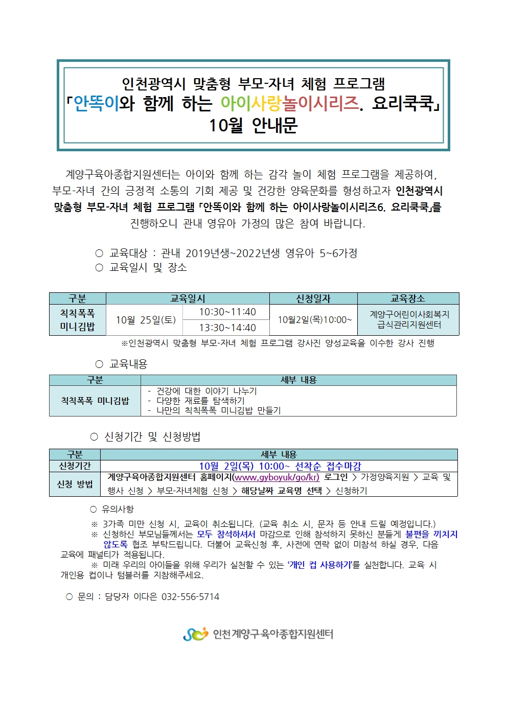 기타사항 | **참여 안내 및 유의사항** ※3가족 미만 신청 시 교육이 취소될 수 있습니다. (취소 시 전화 혹은 문자로 안내드리겠습니다.) ※신청하신 부모님들께서는 모두 참석해 주시기 바랍니다. 당일취소 및 무단불참시 10월 체험 및 교육신청에 제한됩니다. ※부득이한 사정으로 취소 시, 반드시 전화로 연락해 주세요 (032-556-5714). ※해당 연령대에 맞지 않는 신청은 취소될 수 있습니다. 양해 부탁드립니다. ※체험 당일 참석 여부 확인 전화를 받지 않으실 경우, 대기자로 순번이 넘어갈 수 있습니다. ※동일 강의에 대해서는 1회만 신청 가능하며, 중복 신청 시 취소됩니다. |