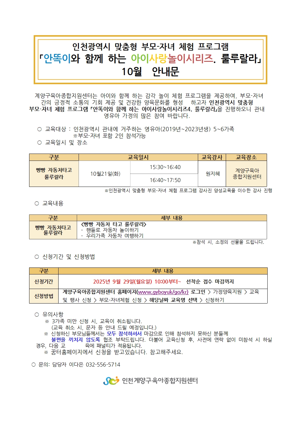 기타사항 | **참여 안내 및 유의사항** ※3가족 미만 신청 시 교육이 취소될 수 있습니다. (취소 시 전화 혹은 문자로 안내드리겠습니다.) ※신청하신 부모님들께서는 모두 참석해 주시기 바랍니다. 당일취소 및 무단불참시 9월 체험 및 교육신청에 제한됩니다. ※부득이한 사정으로 취소 시, 반드시 전화로 연락해 주세요 (032-556-5714). ※해당 연령대에 맞지 않는 신청은 취소될 수 있습니다. 양해 부탁드립니다. ※체험 당일 참석 여부 확인 전화를 받지 않으실 경우, 대기자로 순번이 넘어갈 수 있습니다. ※동일 강의에 대해서는 1회만 신청 가능하며, 중복 신청 시 취소됩니다. |