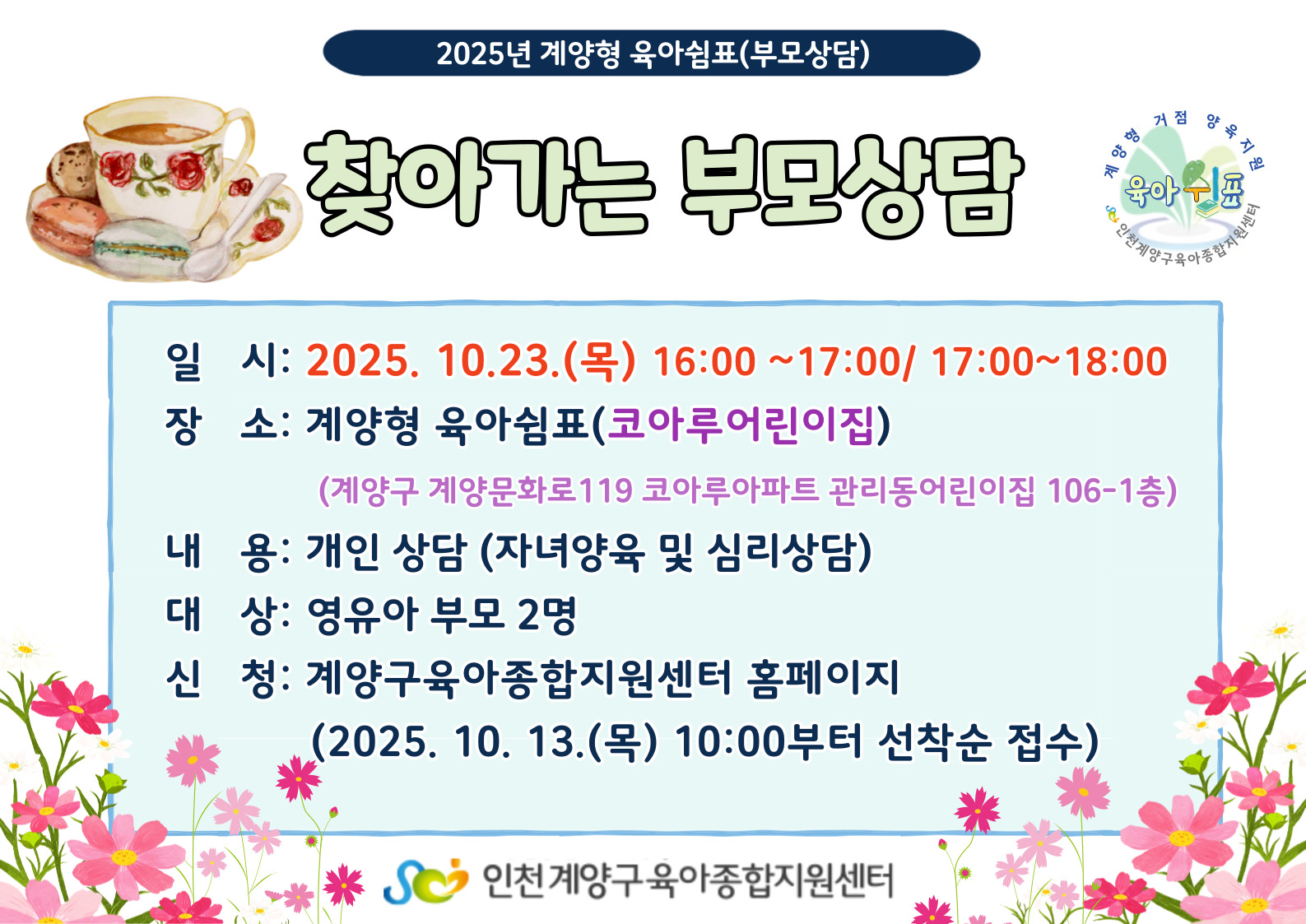 유의사항 | 계양형 육아쉼표 교육으로 지역의 거점어린이집에서 진행됩니다. 교육 장소는 구립코아루어린이집 입니다. (계양구 계양 문화로 119 관리동 106-1층) |